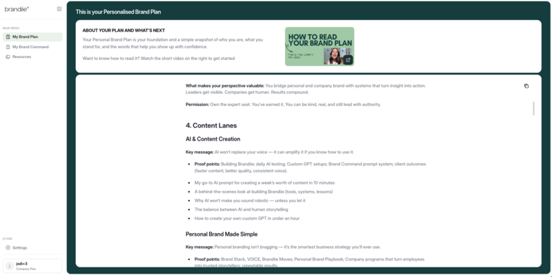 The Brandiie Experience – Create your Brand Plan and your own custom GPT (“Brand Command”) to make writing content easier.